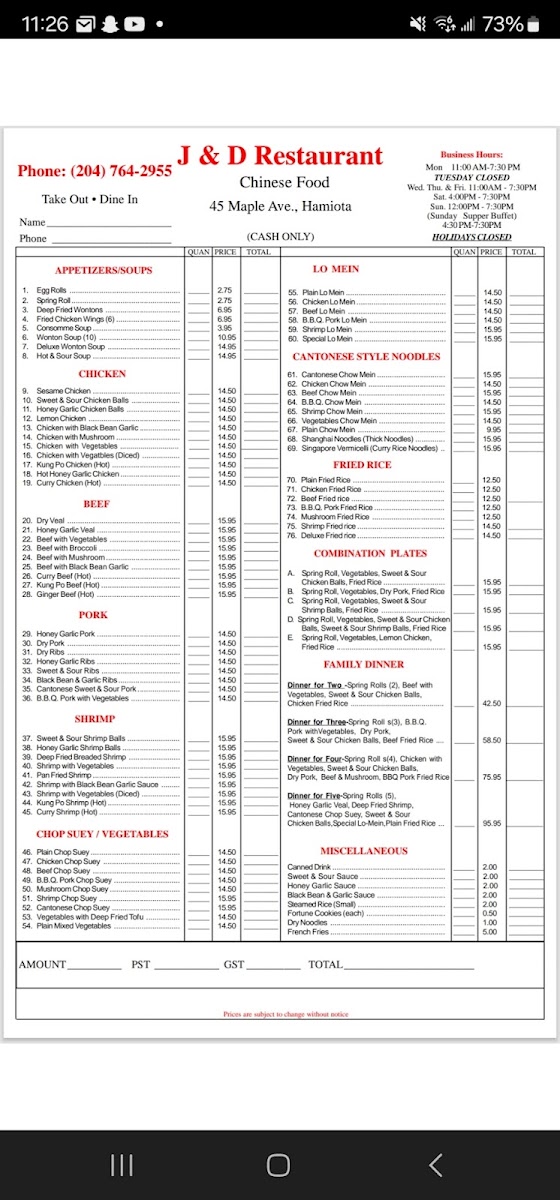 If you find yourself in Hamiota, Manitoba, J & D Restaurant is a must-visit for anyone craving authentic Chinese cuisine that tickles the taste buds and warms the soul. Nestled at 45 Maple Ave, this charming eatery offers an inviting atmosphere where delightful aromas drift through the air, promising a culinary adventure that’s just a menu away.